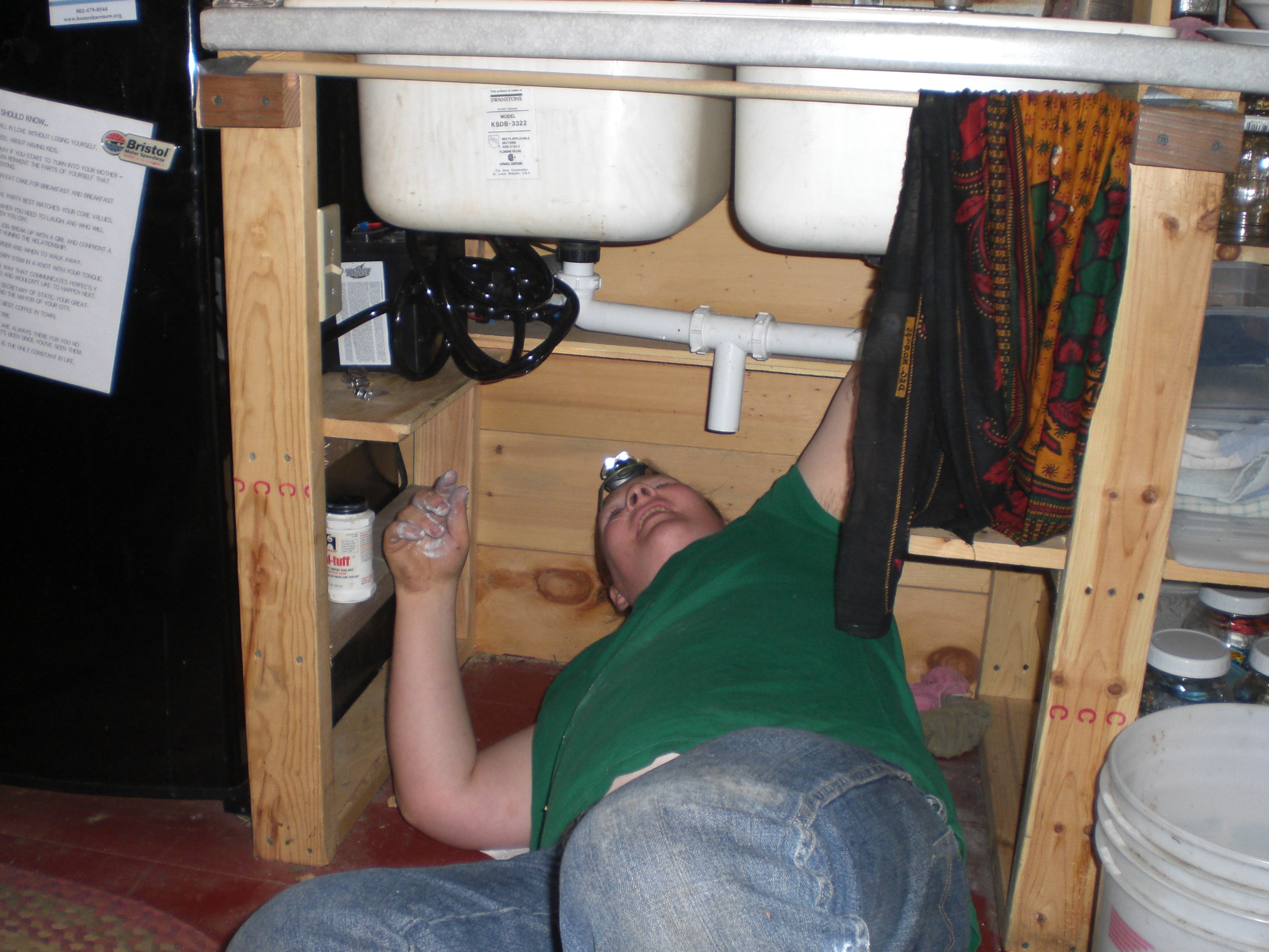 Jamie hard at work under the sink. I think the headlamp is my favorite part.