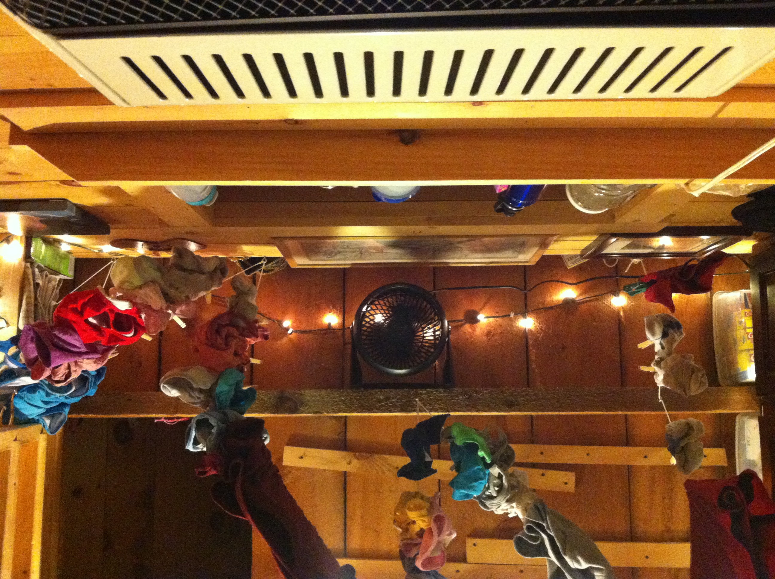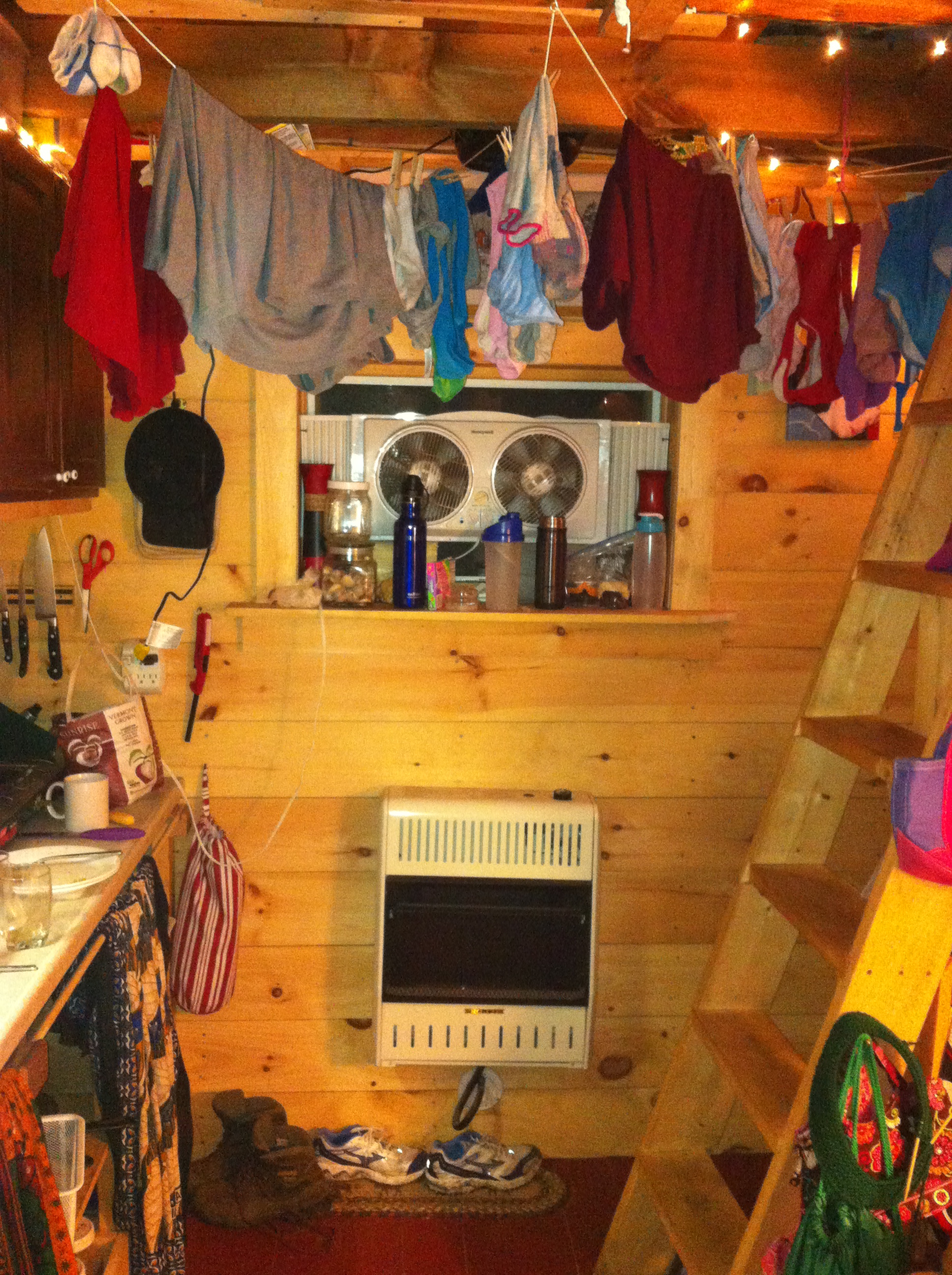So once again I started brainstorming. How could I get the hot air down to the floor?  I decided to take our $15 Walmart fan from beside our bed and attach it to the ceiling (or technically to the side of a loft floor joist) just above the heater.  The photo above takes a bit of imagination, but let me walk you through it. Imagine you are laying down on the floor of our house with your feet towards the front door and your head under the heater. At the top of the picture (the top of your field of vision) you can see our heater, and glancing down the photo you can see the underside of the windowsill, then the window opening. Keep following and you can see a picture hanging on the wall above the window, then the first bay of our ceiling where I mounted the fan.  Not only does it keep the warm air down, it drastically shortens the drying time of clothes on our lines in front of the heater. In case that photo makes you dizzy, below is a right-side-up shot of the same wall from the entrance of our house.