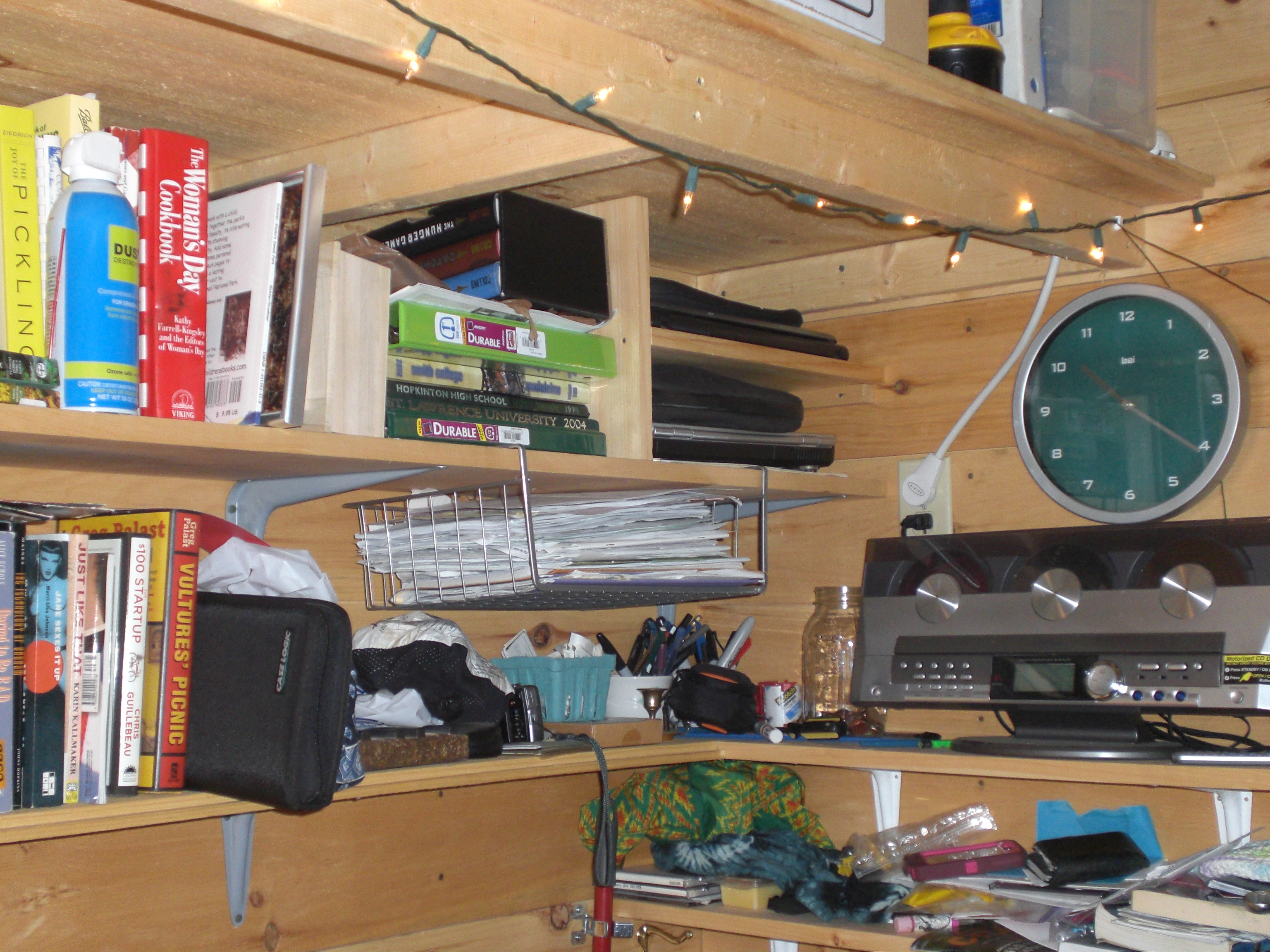Jamie gave away her old laptop and I only bring my work laptop home some of the time, but it’s still a mind-boggling number of computers for 120 square feet. I asked Jamie to build two cubbies on one end of our highest book shelf thinking it would be a good out of the way place to store the laptops when they’re not in use. She measured the computers and gave herself a couple of extra inches, adding a vertical board and a horizontal board to halve the space and allow us each our own computer cubby.