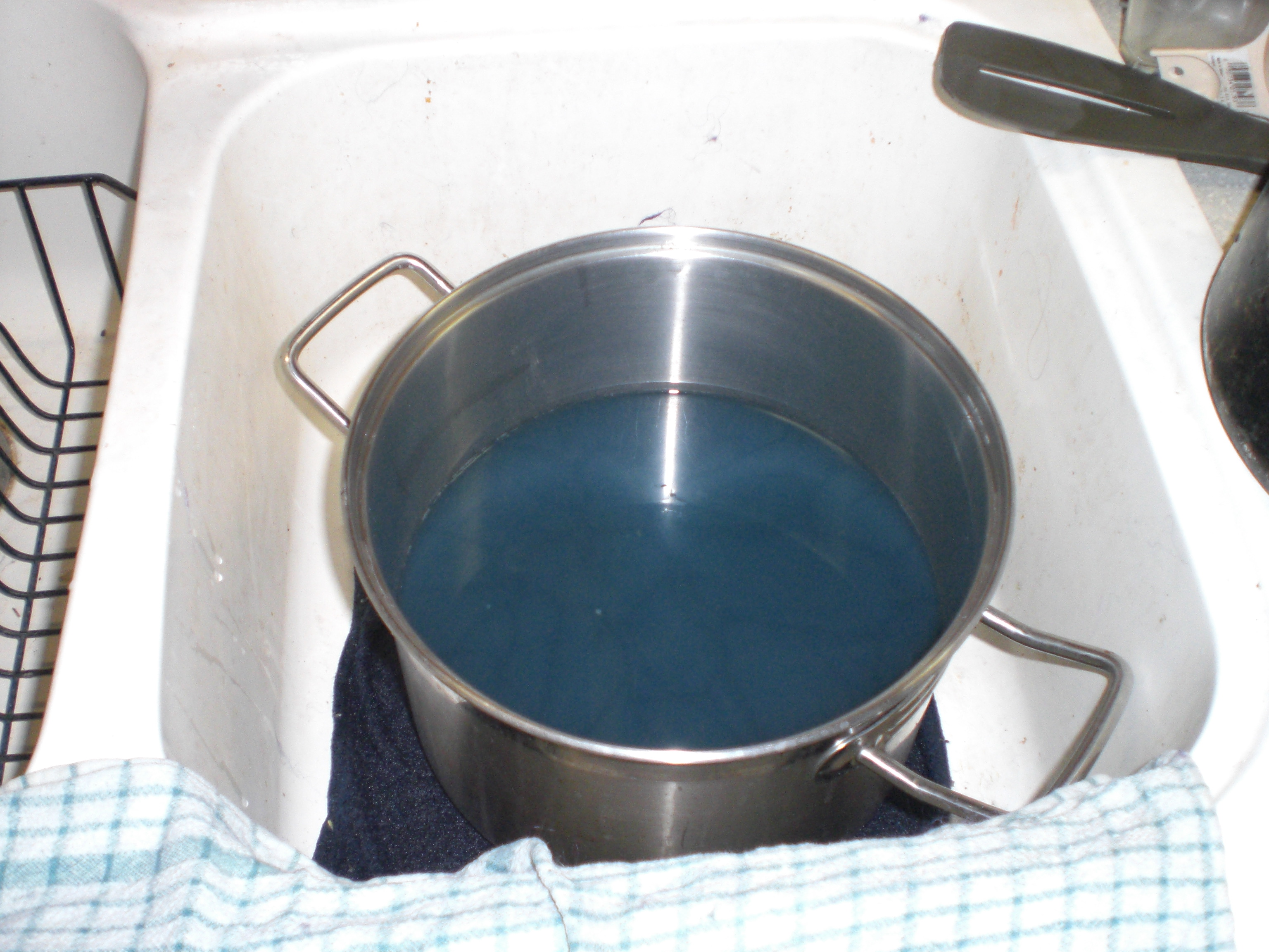 The easiest way to felt projects is to put them in a delicates bag and felt them in a top loading washer, checking frequently throughout the process to see if the fibers are felting together and the piece is shrinking the way it should. Not having access to a top loading washer, I went with hand felting. I found a lovely tutorial that explained how to felt using super hot tap water and a plunger in your bathtub. Well, I don’t have a plunger, bathtub or even hot tap water so I had to (as I do very often) think outside the box. I used a large stainless steel pot filled halfway with tap water and heated it on our propane stove to just under boiling, then put the pot into our sink. I added some dish soap to the pot and used a potato masher to agitate the knitted fabric, alternately wringing it out and dipping it into a pot of ice water to help the fibers felt.
