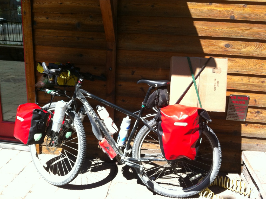This morning we awoke early to a what seemed like a big storm brewing so we packed up fast and left camp early. We tend to try to be on the road by 830 or 845 and today we’d gone almost 10 miles by 830. There is something to be said for getting up early. Most of the day today was descending from Red Meadow Lake to Whitefish Lake, but it was still slow and very, very bumpy. I had to stop every mile or so to reattach my panniers and was paranoid they would fall and break something on my bike or hurt someone riding behind me. The sense of relief of rolling into the bike shop this afternoon and mounting my brand new Ortleib panniers on my bike was fantastic.