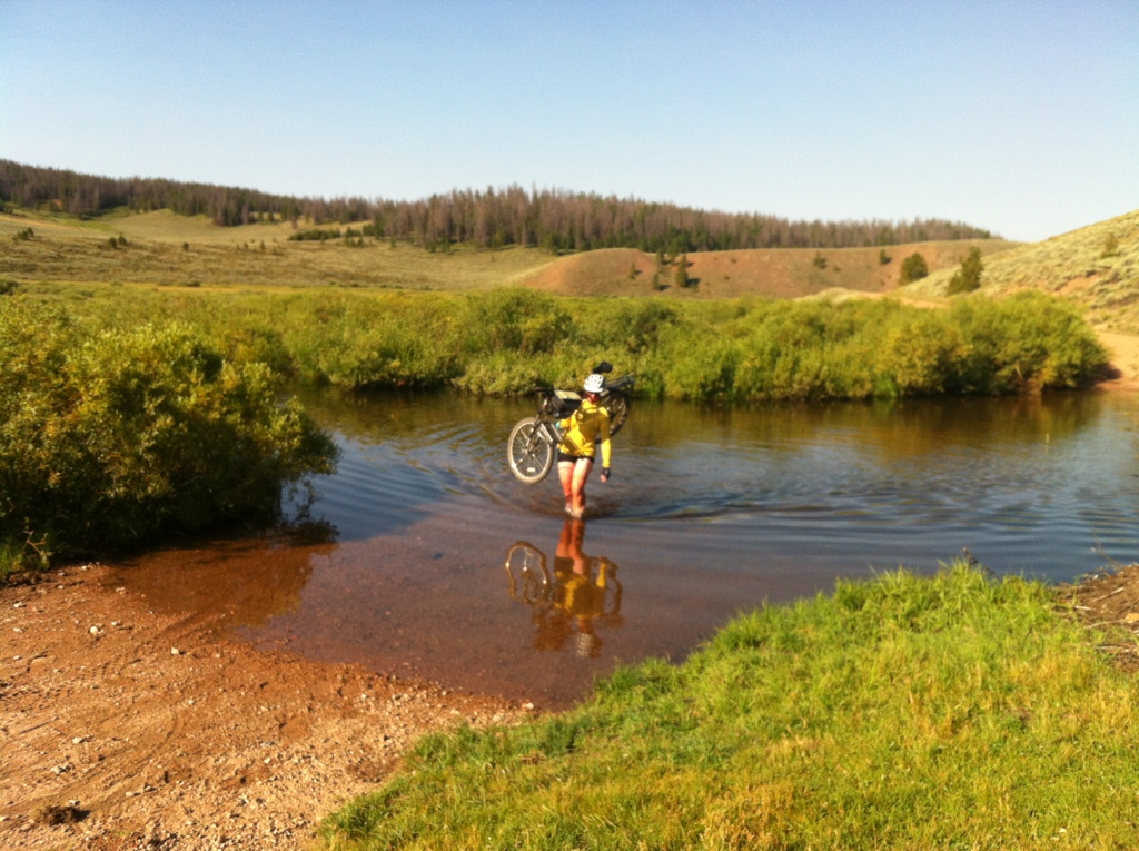 At night it dropped to around freezing as we were camped at over 9000 feet! The morning was frosty cold and began with a long descent on which we wore all of our warm clothes! It was only a 43 mile day, but we left fairly early mostly to warm ourselves up. Less than 5 miles in we came to a spot in the road which didn’t have a bridge and required either a long detour or a short portage…. The water was cold and nearly waist deep due to recent beaver activity but we weren’t deterred, it was only 30 feet across.