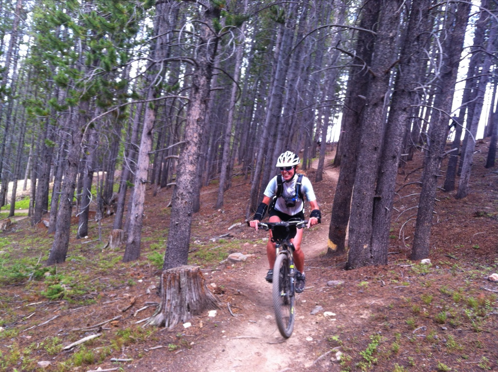 Once we arrived in Breckenridge we learned that it was their annual Bike Week Celebration.  What amazing timing.  Downtown was a huge market of vendors giving out samples and selling discounted gear.  The Fiz ‘Ik company was giving away free biking socks to any Great Divide Riders, Cliff Bar had unlimited samples, and lots of bike shops and brands were doing free bike Demo’s.  I quickly got myself on a $6,000 fully suspended Carbon Fiber mountain bike and once again fell in love.  Susan, John and I bought lift tickets and headed up the big ski slopes.