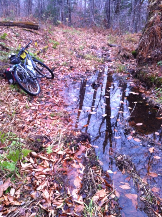 Three miles of steady climbing on the above type of road and I came to the snow machine junction with a sign pointing left towards Worcester.  I turned left through a mud pit nearly up to my hubs and fell once bush-whacking my way (is it called bushwhacking on a bike?) around the first gate.  Slippery sticks under a thick coat of fallen leaves will get you every time!