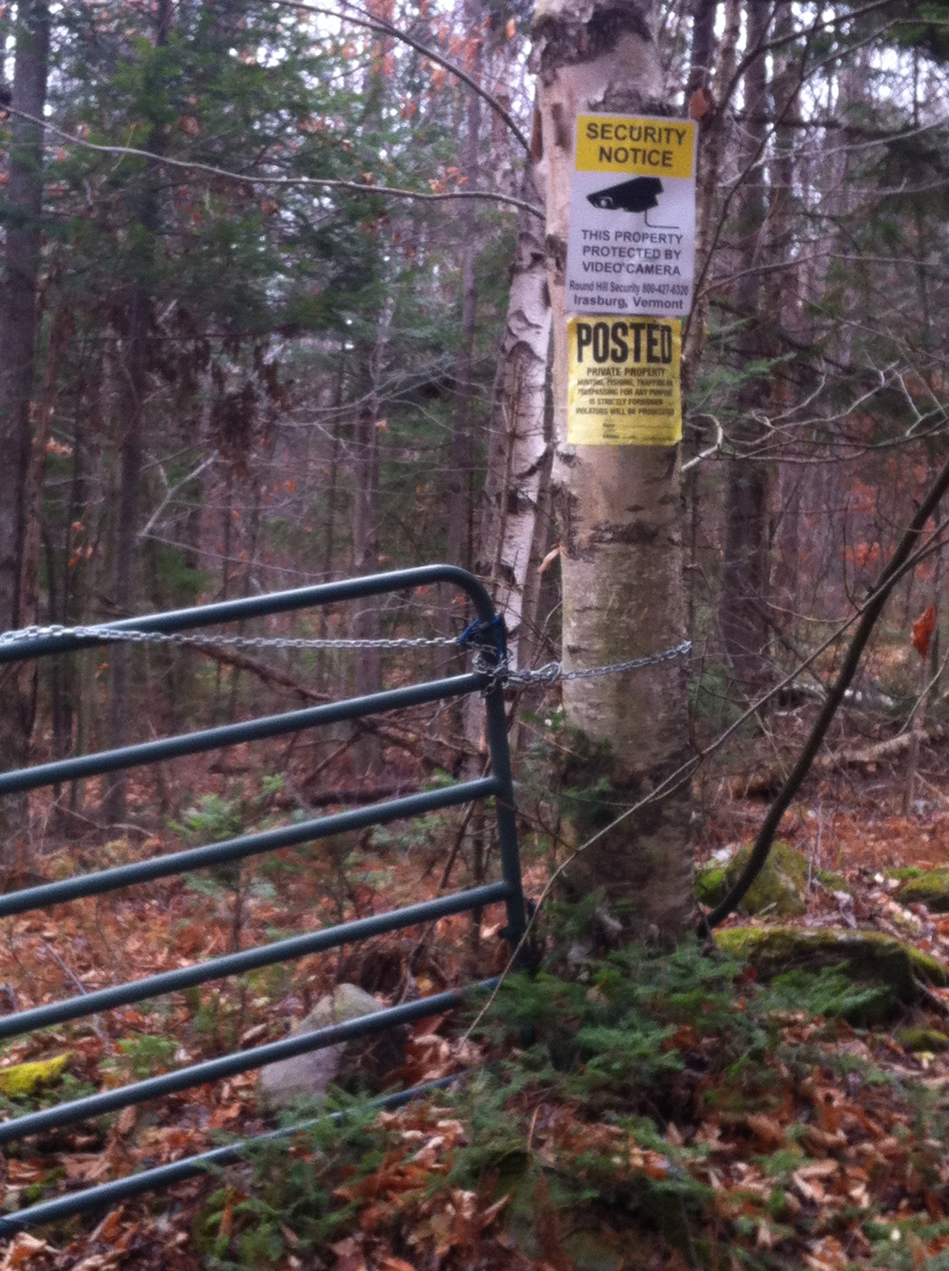 This first portion of Shepherds Hill Road is nothing more than a barely discernible overgrown snow machine trail with many trees across it, so it was slow going at best.  If it hadn’t been for the snow machine trail signs nailed to an occasional tree, I may have turned back – unsure if I was on the right track.  Around mile 5 I came to a large metal gate padlocked shut with no trespassing signs and a monitored by closed circuit Camera Sign.  I knew right where I was because on my last attempt through I’d turned around at the matching gate coming from the other direction.  No turning back now!