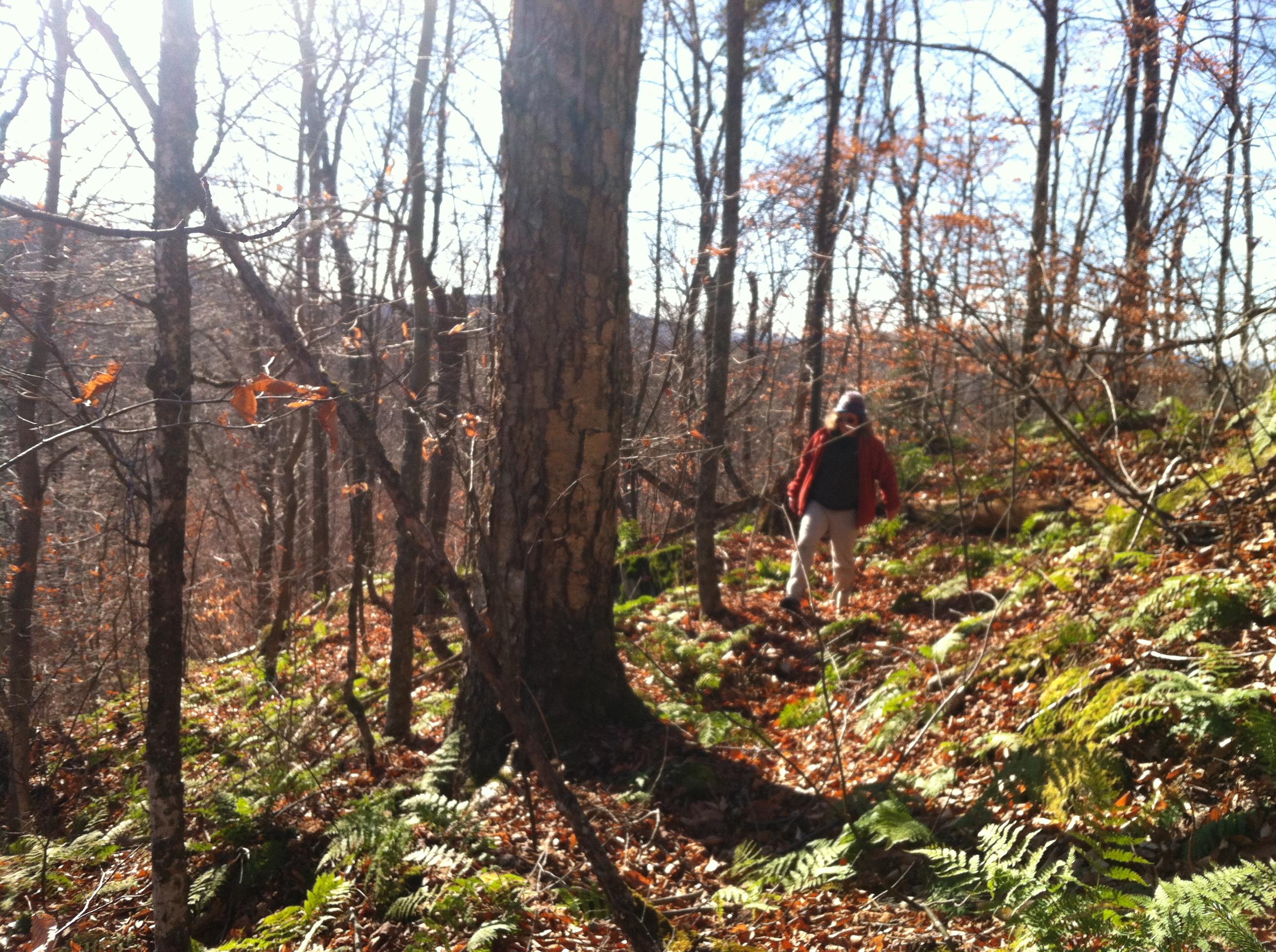 For my Sunday adventure I teamed up with Mom, Steve, and their dog Rufus.  We packed a picnic lunch including the necessary leftover Halloween Candy and headed out on foot.  We started on a ski trail from behind our house to the field by the Bucks House about half a mile up the road. Steve remembered the way though he hadn’t gone up there via this route in at least a decade or two.   He took off with Rufus on his heals through the thick brush at the edge of a field.  “There’s no trail?” Mom asked.  “Nope, but we’ll cross the Hawkins Pond Road at the top of the next ridge” Steve promised.  Mom and I looked at each other and picked our way through the swampy underbrush, starting up a steep ridge.  We were using the contours of the hill as well as the glimpses of Woodbury Mountain to the North to find our way and stay on track.  We’d occasionally join up with a trail or woods road and follow it as long as it was going the right direct, and then when necessary Steve would plunge us back into the forest to stay on track.