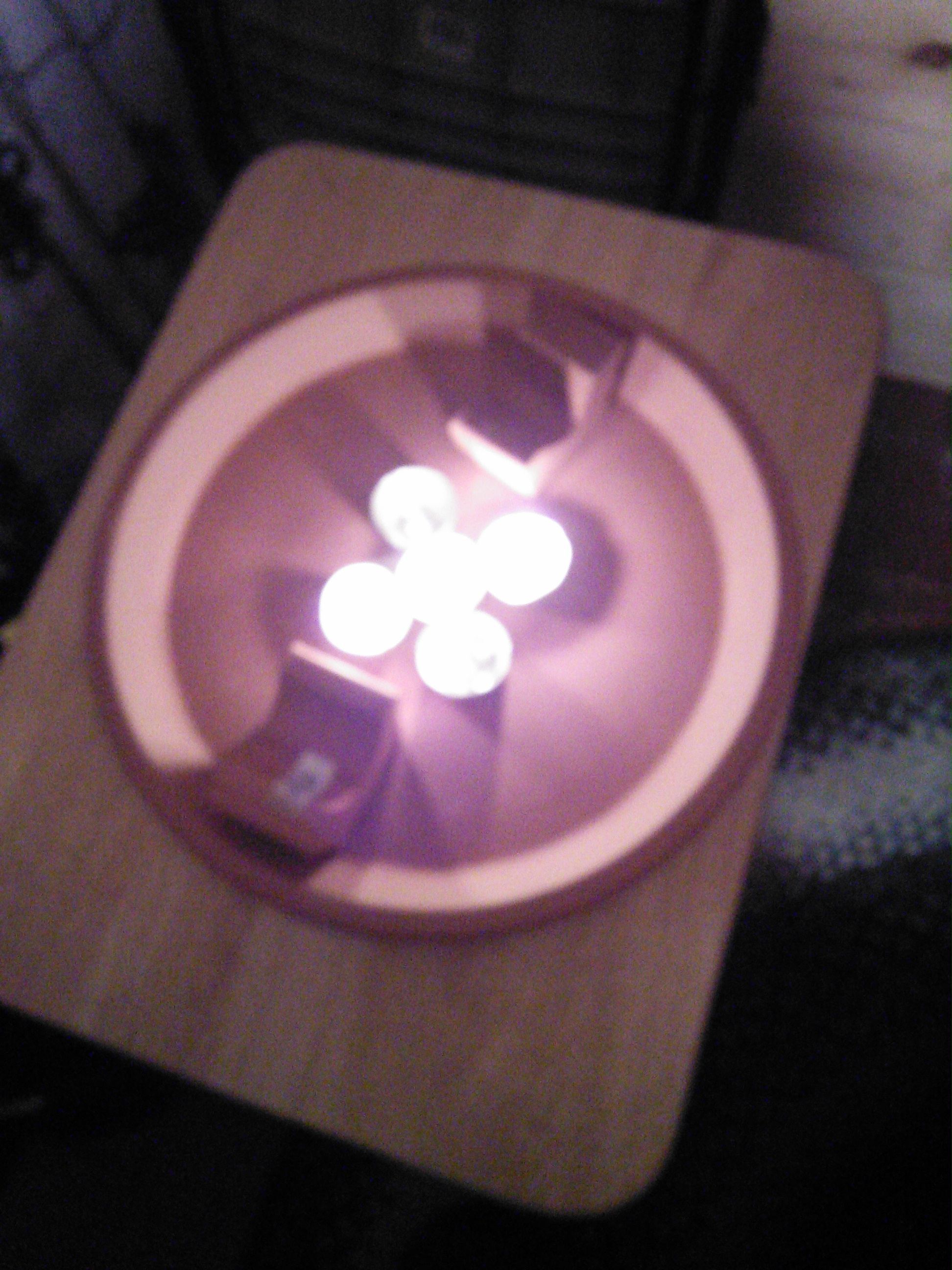This picture shows the base, a clay plate with 5 Tea-Candles on it. The candles you can buy online or at any hardware store in bags of 100 or more, they cost only a few penny’s each (here’s 100 from Amazon for $10!). The base I bought for $3.99. I lit the five candles, and then placed the small clay pot upside down over the candles and plugged the whole in the center of it with tinfoil.