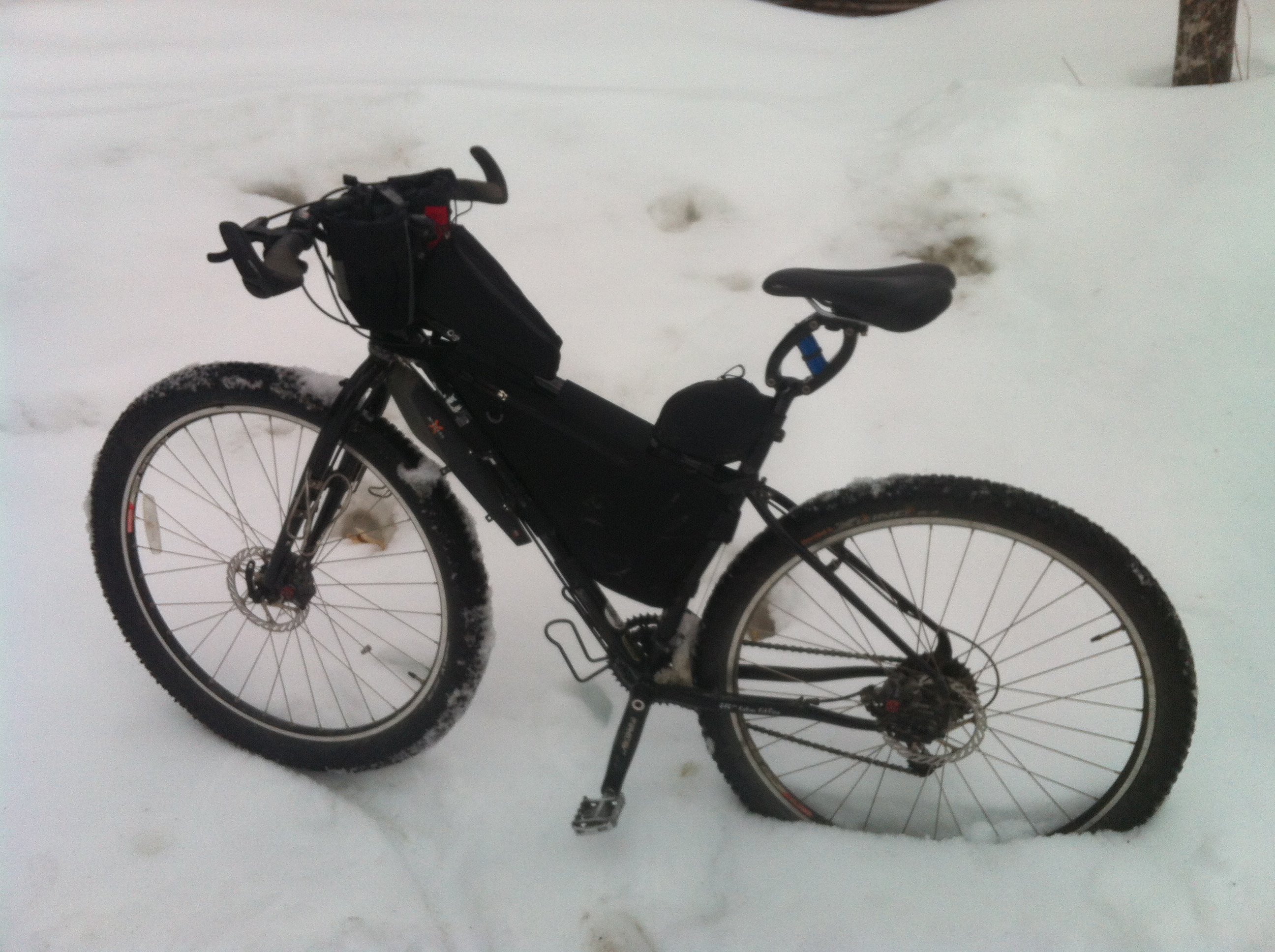 Here’s my Surly with the two top tube bags, the frame bag, and the two feed bags on the back of the handle-bar. In this shot it’s missing the front handlebar roll and the seat bag. Since riding the Great Divide Mountain Bike Route (GDMBR), I added the thudbuster seat post suspension, upgraded the front wheel to a 3.0 Fatty, and replaced my Cassette to get a slightly easier climbing gear.