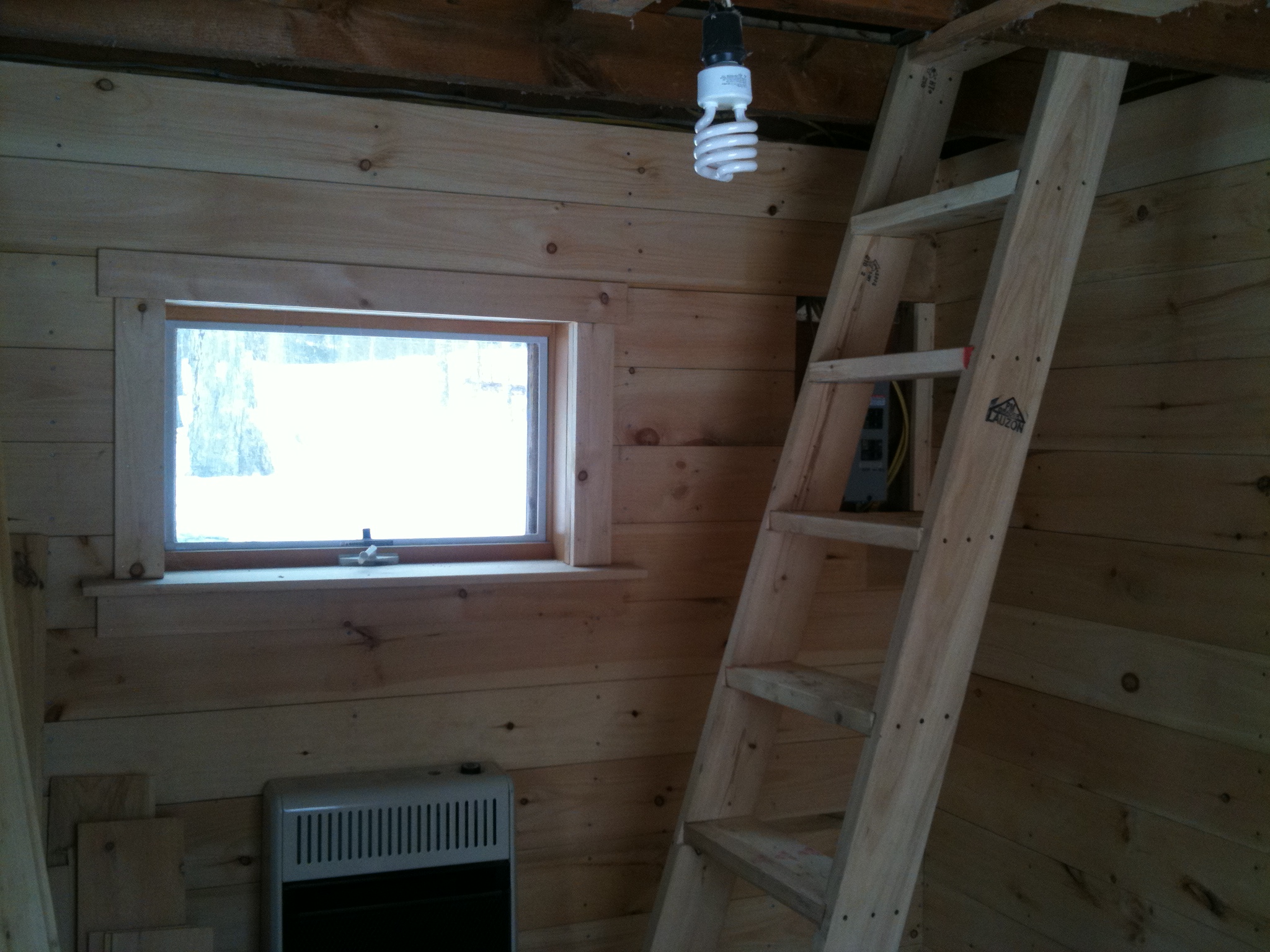 One window in, the downstairs is now heated with 6 inches of blown in cellulose, and I have heat! I hemmed and hawed on the steepness of the ladder to new loft opening. Vertical would waste less space but be harder to climb – i ended up matching the angle of my 6 foot step ladder which I know is easy to climb. It’s a compromise I’m happy with. Now how to best use the space behind it? A Bathroom!