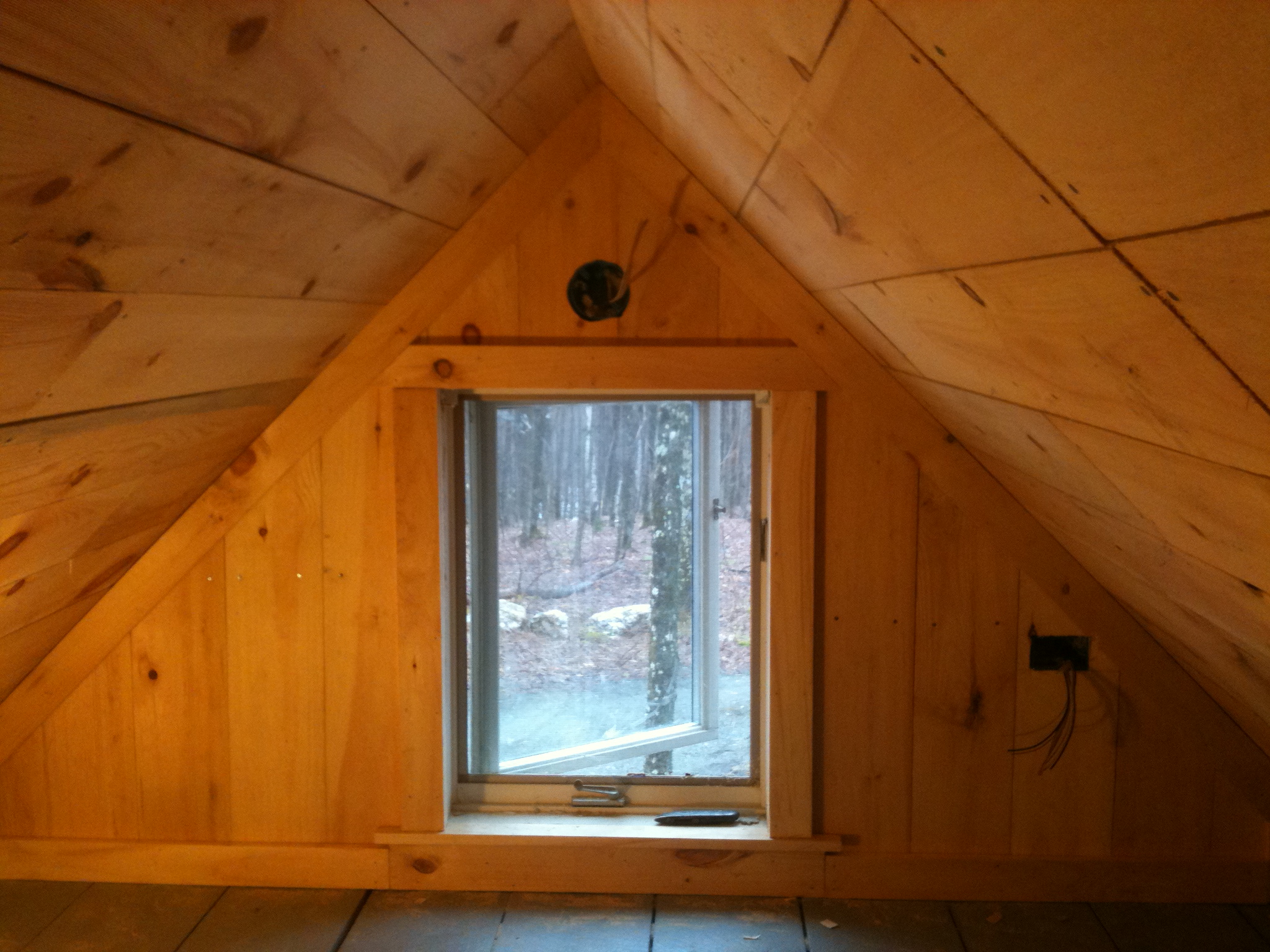 finished loft ceiling, endcap and window! The loft has a window at one end and shelves at the other. Each end has a light and an outlet.